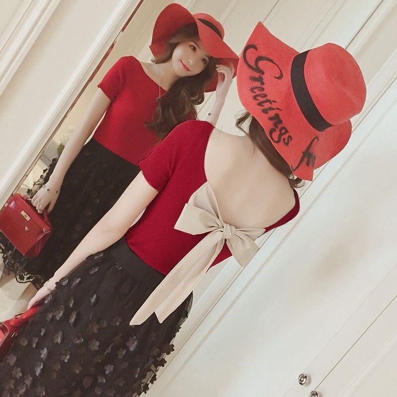 シャツセクシーコットン Tシャツ背中開いたクロップトップ弓ストラップスリムフィット半袖 Tシャツ Camisetas 黒 Tシャツ ショート ブラック リボン ハーフスリーブ