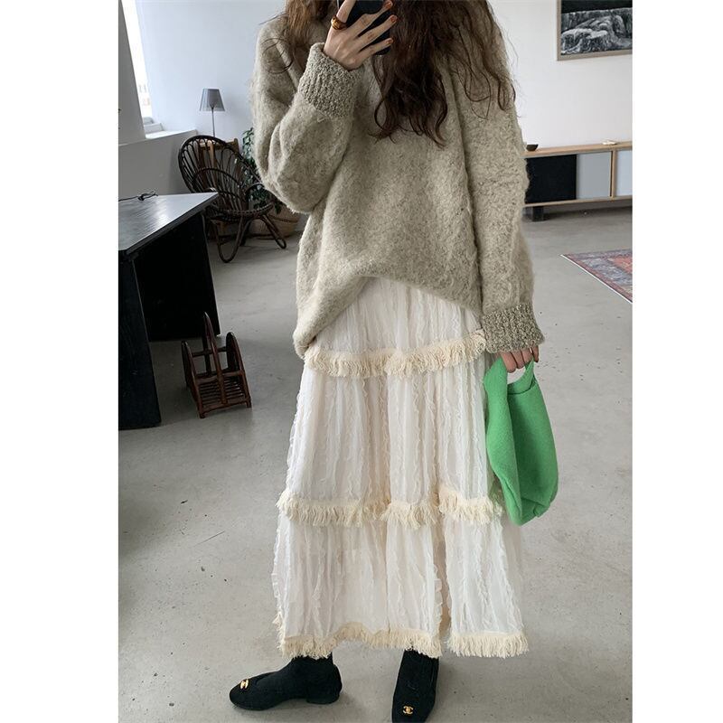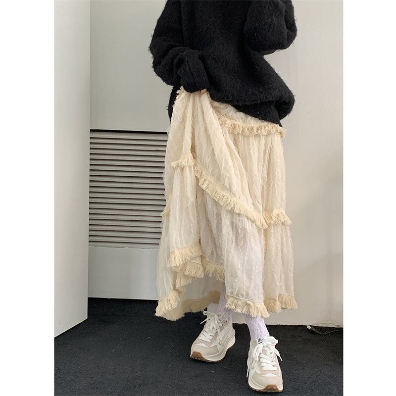 レースロングスカートウエストルーズフェアリーコア電話パッチワーク A ラインミディスカートガール秋段 Faldas オータム 秋物 Aライン
