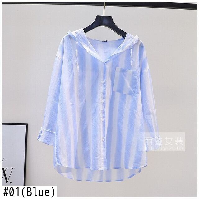 日焼け止めコットン長袖フード付きピンクストライプシャツカミーサシャツトップブラウス ロング