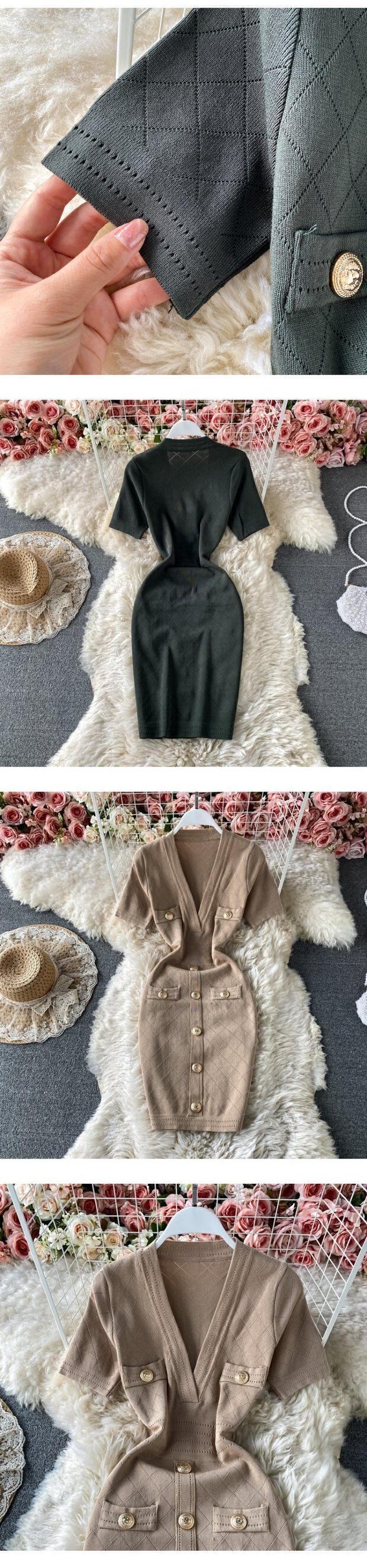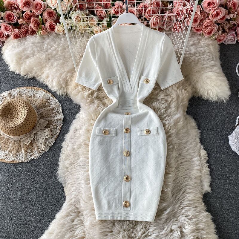 ディープ V ネックお尻ラップ半袖ニットドレス Vestido Feminino Y2k ボタンチェック柄ミニドレス Vestidos セクシー ショート ハーフスリーブ Vネック