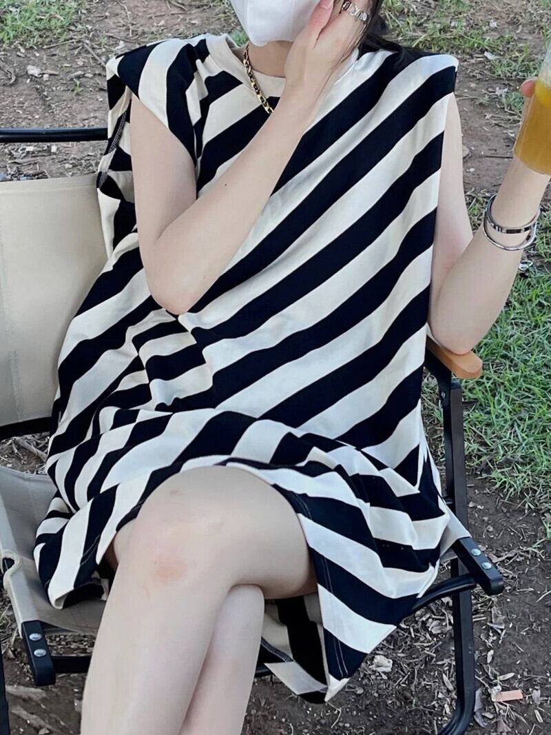 ローブ マキシ ドレス Vestido Feminino O ネック ルーズ フィット肩パッド ノースリーブ ストライプ T シャツ ドレス Y2k Oネック Tシャツ