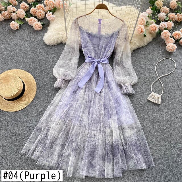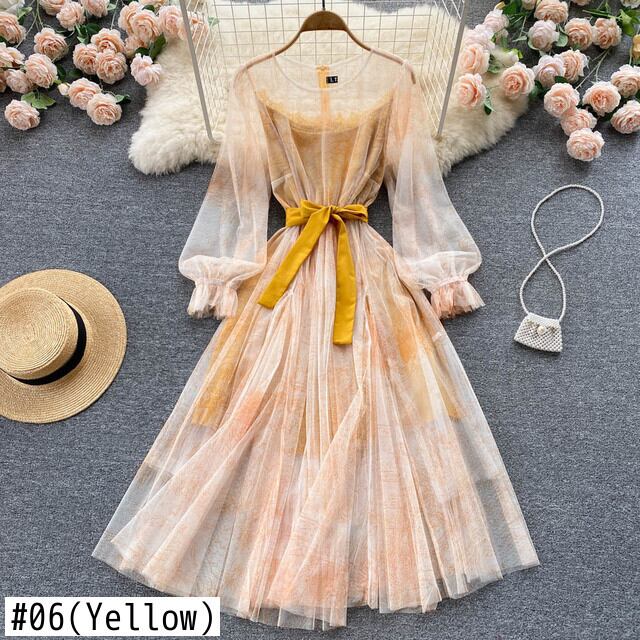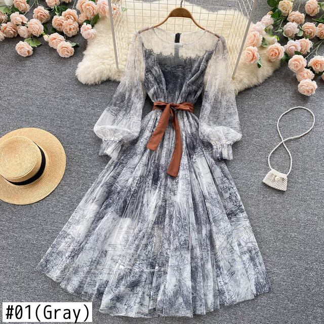 Vestidos es 長袖メッシュドレス春秋レースアップウエスト誕生日ローブパーティーマキシドレスプリント ロング スプリング 春物 オータム 秋物