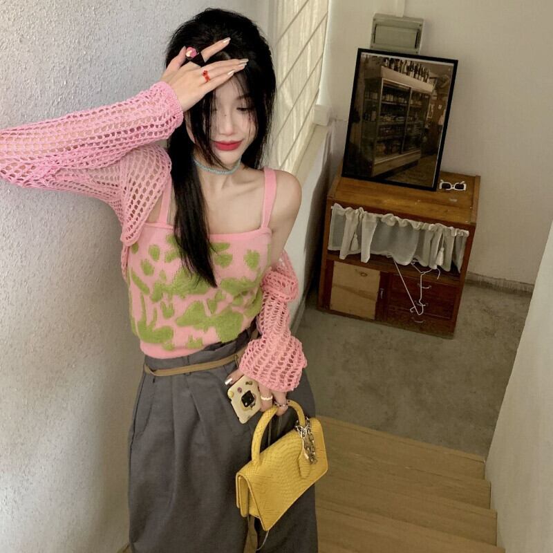 タンク キャミソール トップス 中空アウト日焼け止めシャツ プル Y2k セーター デ 2 セット クロップド ピンク ホール カーディガン ニット セーター 2セット