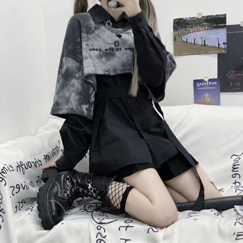 ese Ins 2 点セット秋服クロップドタイダイスウェットシャツ白長袖ブラウス Y2k スーツトップス ロング ホワイト オータム 秋物
