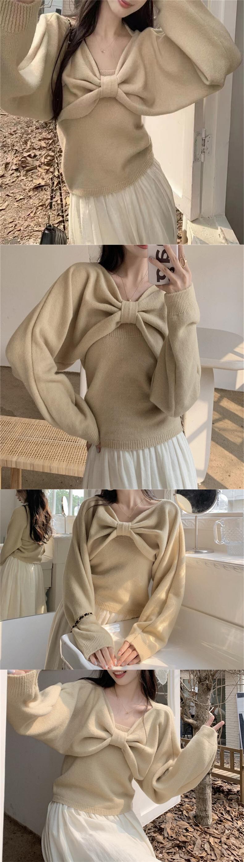 Sweet Bow 長袖セータースリムフィットシンプルニットタンクトップ秋冬シック 2 点セット Y2k ロング リボン 大人ガーリー スウィート キュート カジュアル オータム 秋物 ウィンター 冬物