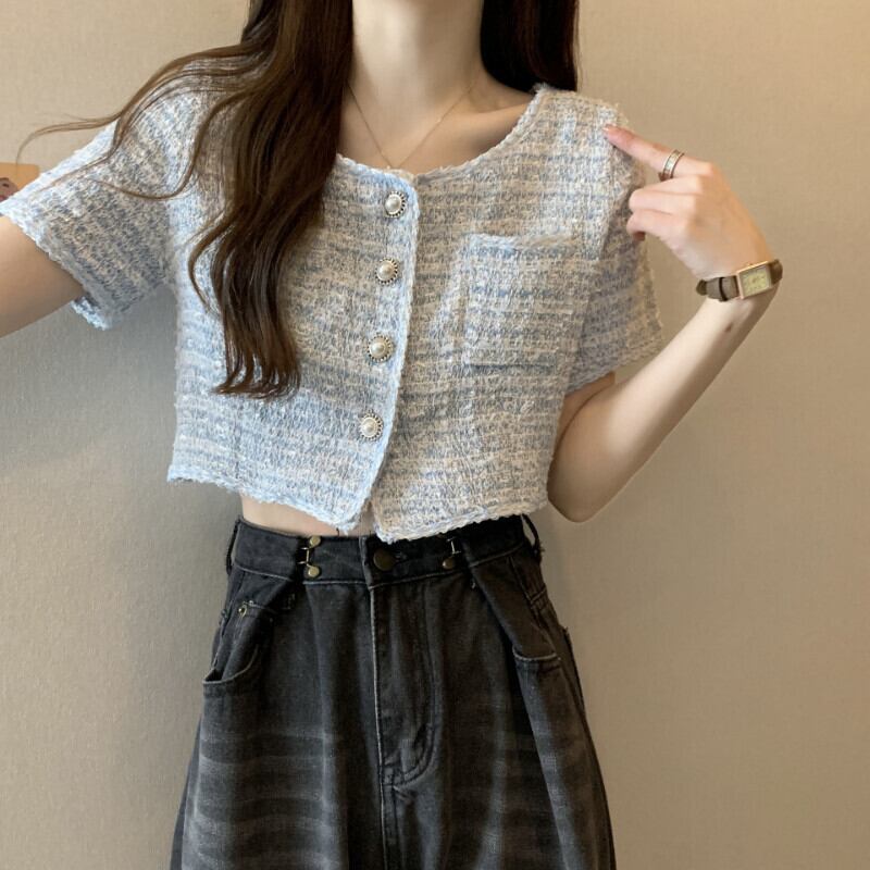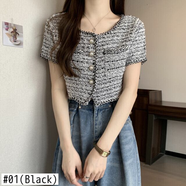 半袖ブルーツイードジャケット夏クロップトップスタイル Y2k シャツ黒、白ボタンシャツ ショート ホワイト ブラック ハーフスリーブ サマー 夏物