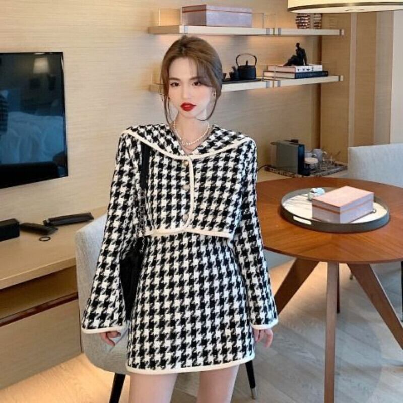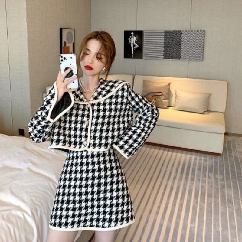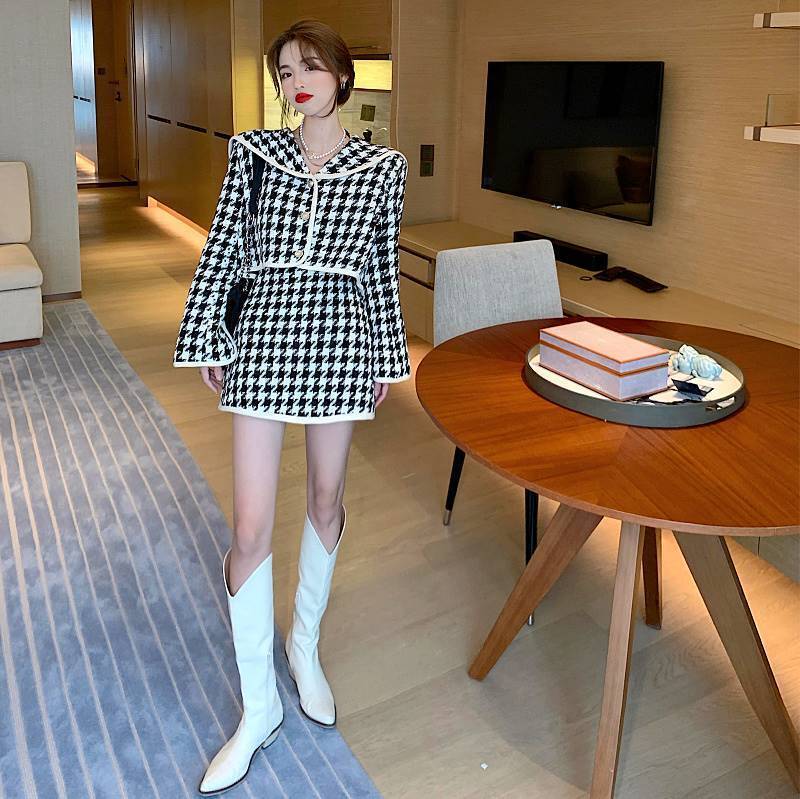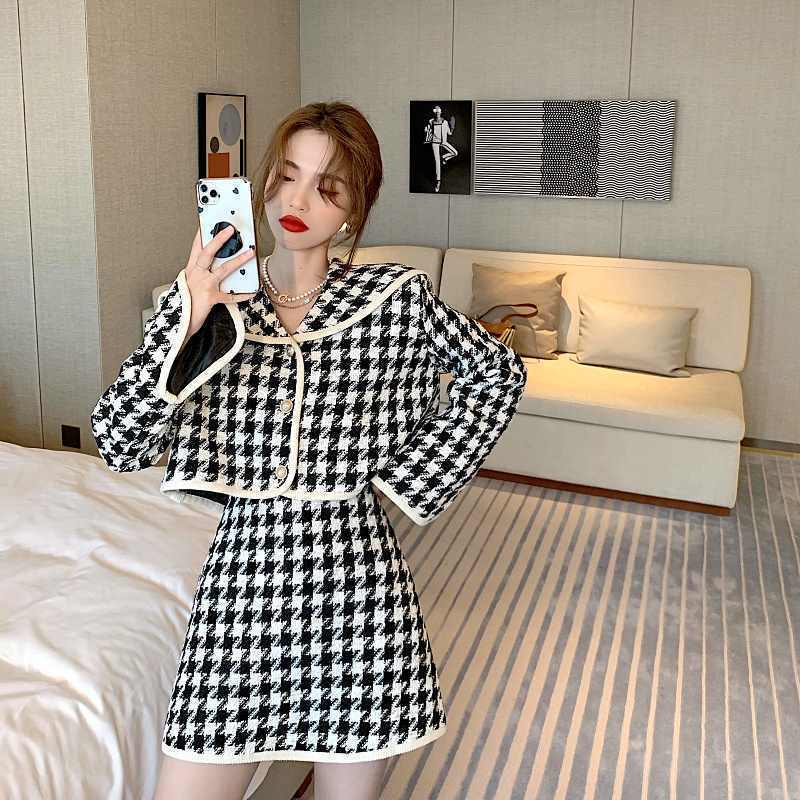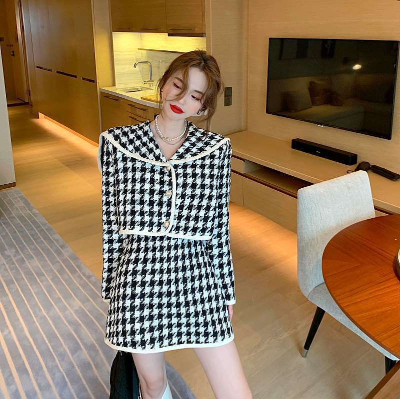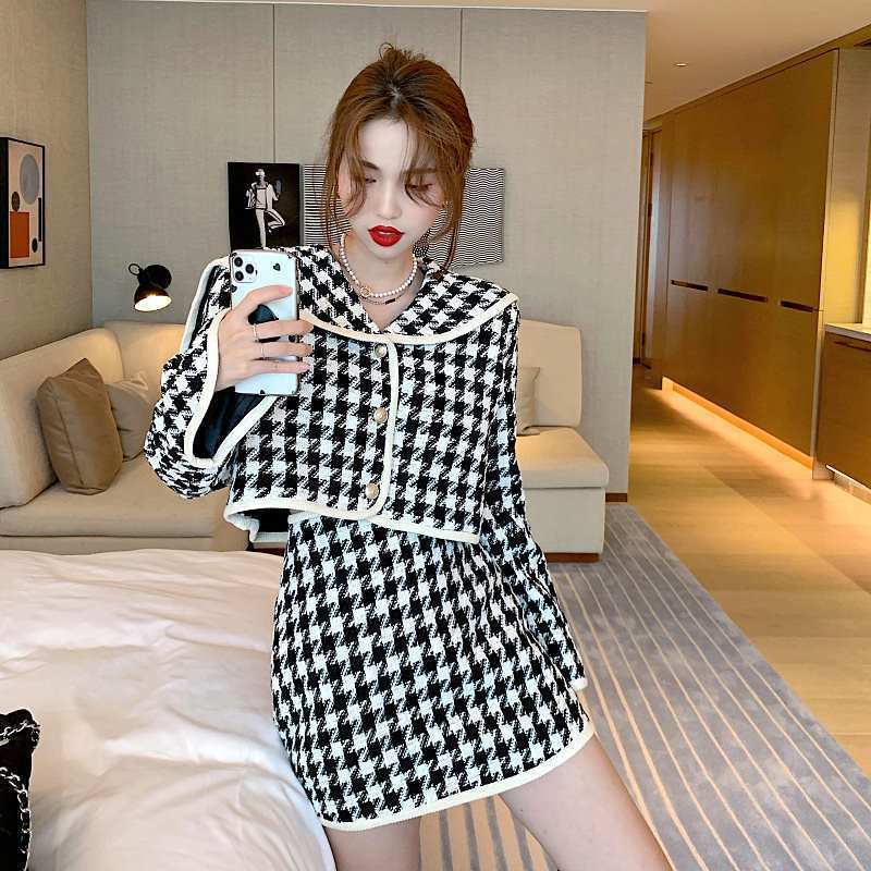 スカートセットショート千鳥格子ジャケットセーラーカラーコートウールクロップカーディガンミニスカートツーピースセット秋 オータム 秋物
