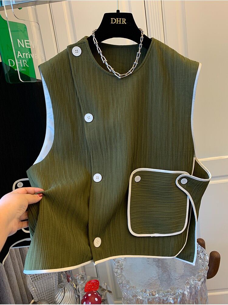 ルーズ春パッチワークポケットベスト Chalecos パラノースリーブ黒チョッキ Y2k ジャケットシックコート ブラック スプリング 春物