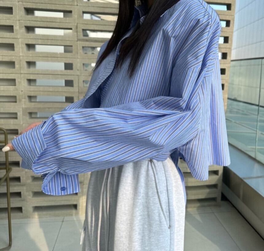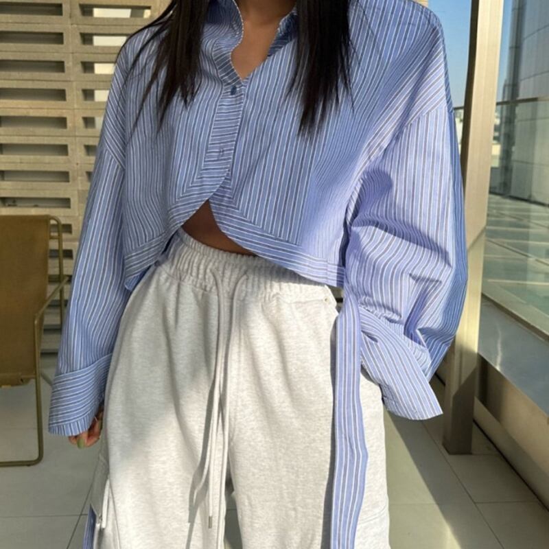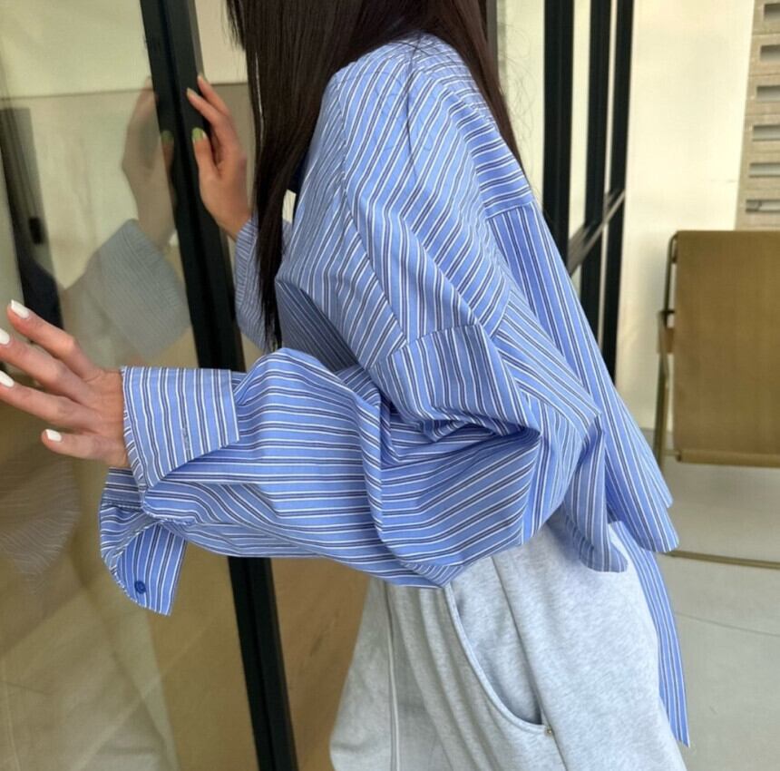 ラペルカラーコントラストストライプ長袖ショートシャツ De Moda オフィスレディトップカミーサブラウスシャツ ロング 会社 学校 通勤や通学にも