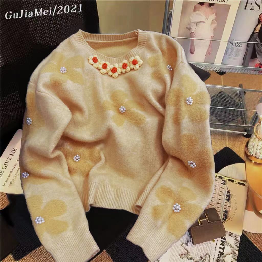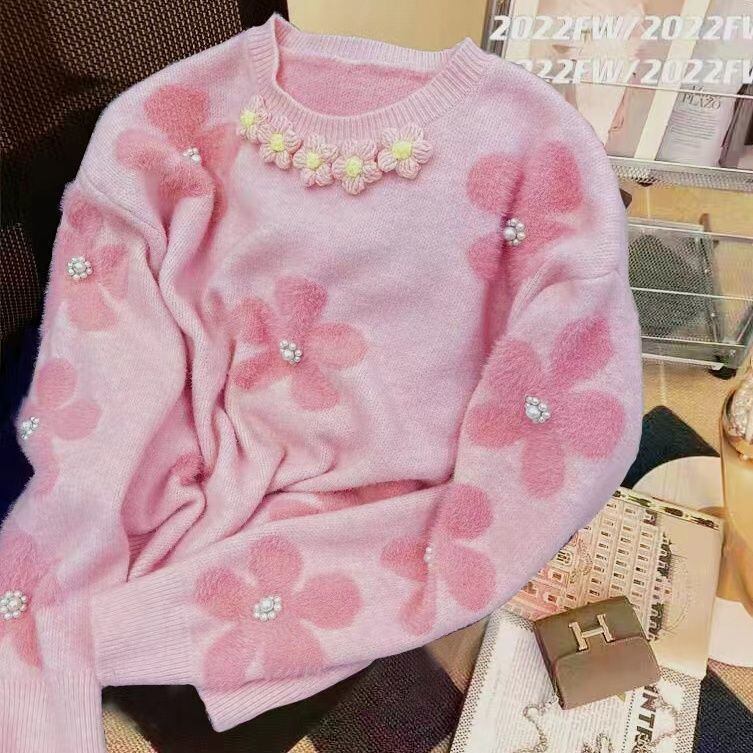 ブルー刺繍花セーター Y2k 服セータービーズセータージャンパープルトップスニット レッド フラワーデザイン