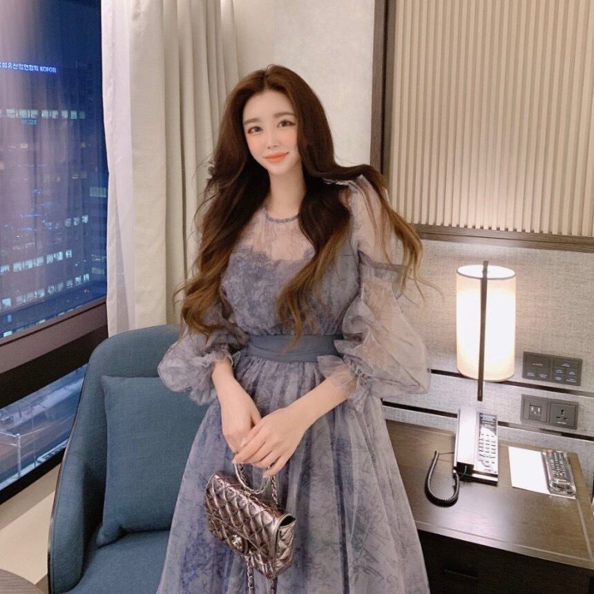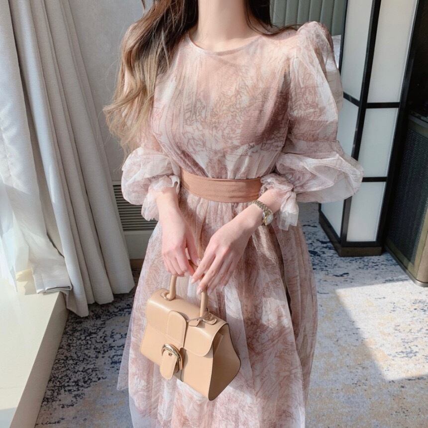Vestido Feminino 気質レトロバブルスリーブウエストローブビーチ遠近インクドレス Elgeant マキシドレスプリント