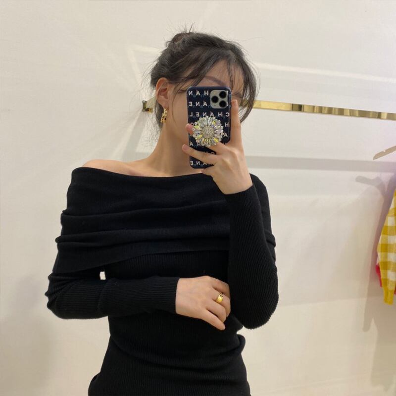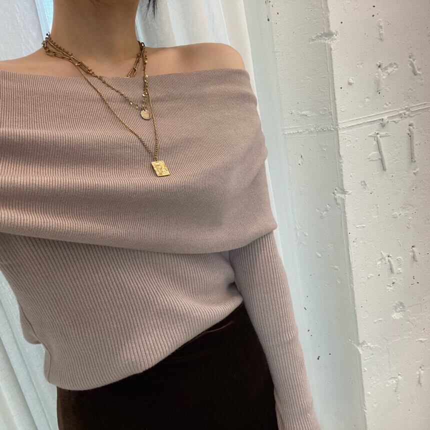 スラッシュ ネック スリム フィット オフショルダー セーター ブラック ニット シャツ セーター カーキ トップ ジャージ ジャンパー プル