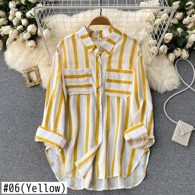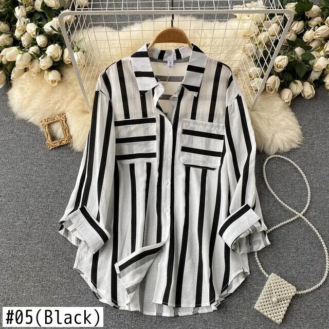 シックトップスターンダウンカラー長袖ストライプシャツ多用途ブラウスオーバーサイズ ロング