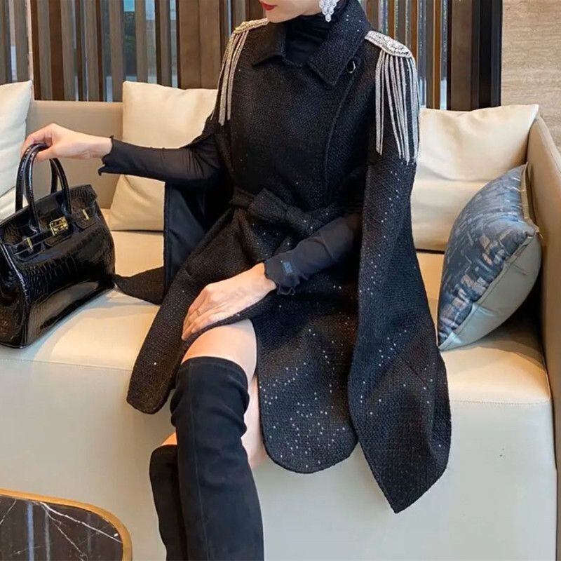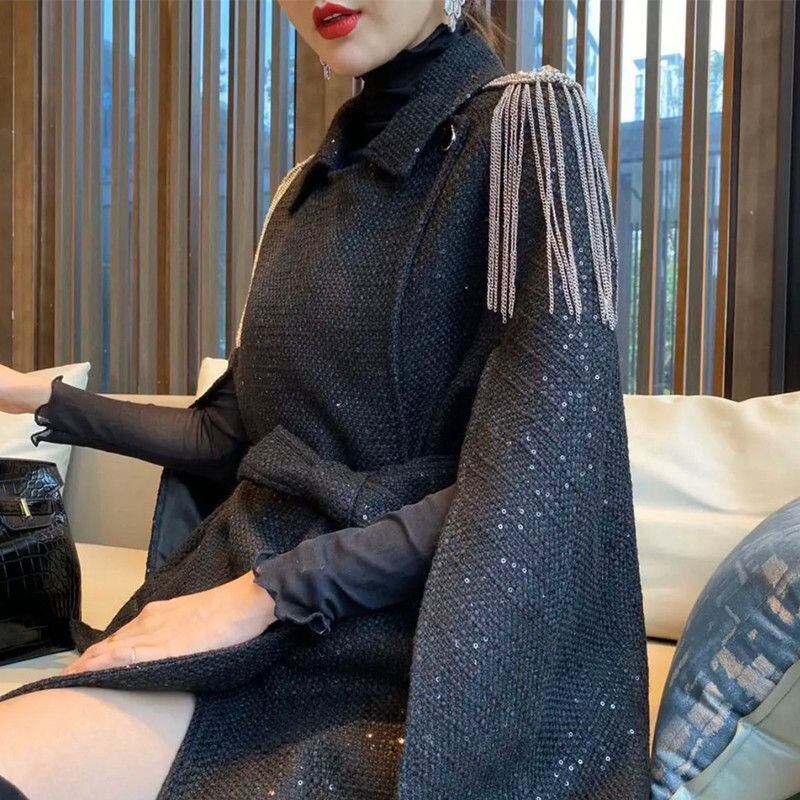 ケープ & ポンチョ黒トレンチウールコートチェーン冬ジャケットベルトウエストオーバーサイズグランジ Y2k Chaquetas ブラック ウィンター 冬物 ハーネス