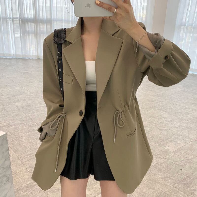 巾着ブレザーレトロカーキブレザー 1 ボタンスーツカラーコート黒ブレザー Femenino Y2k ジャケット ブラック