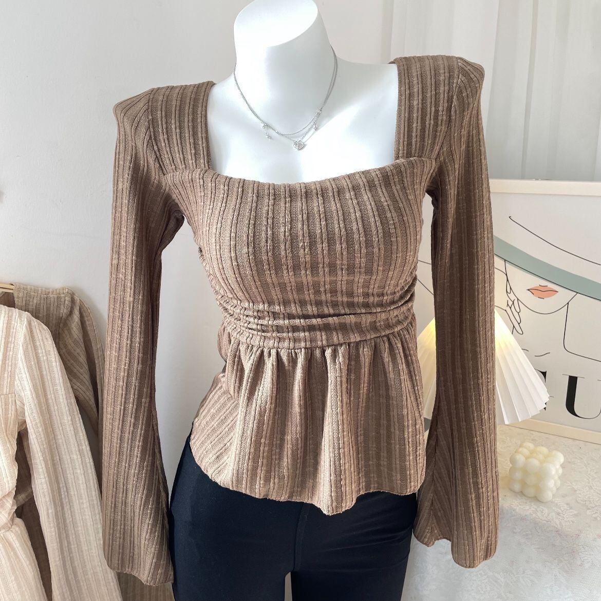 シャツ秋フレアスリーブ Tシャツ人形ボトムスクエアネック長袖トップスリムソリッド Tシャツ Tシャツ Ropa ロング オータム 秋物 ソリッドカラー スクウェア
