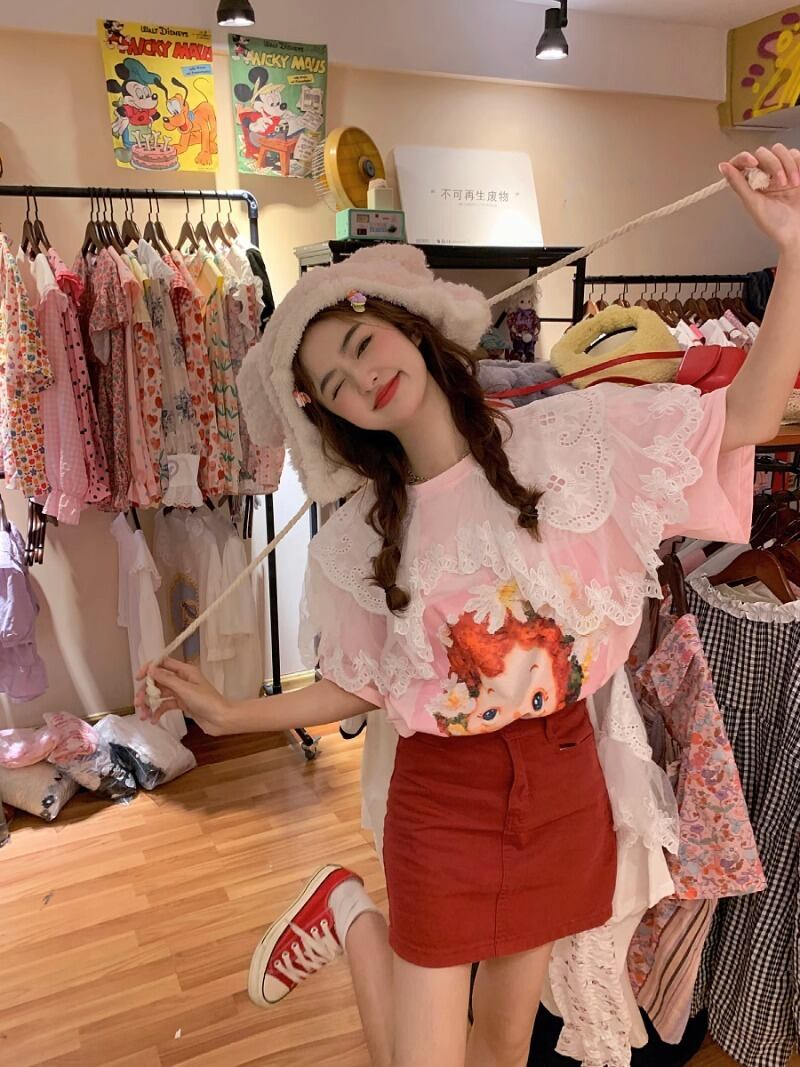 ガールズプリントドールネック半袖 Tシャツ Y2k トップ白漫画 Tシャツ原宿グラフィック Tシャツグランジ特大 ショート ホワイト ハーフスリーブ かわいい