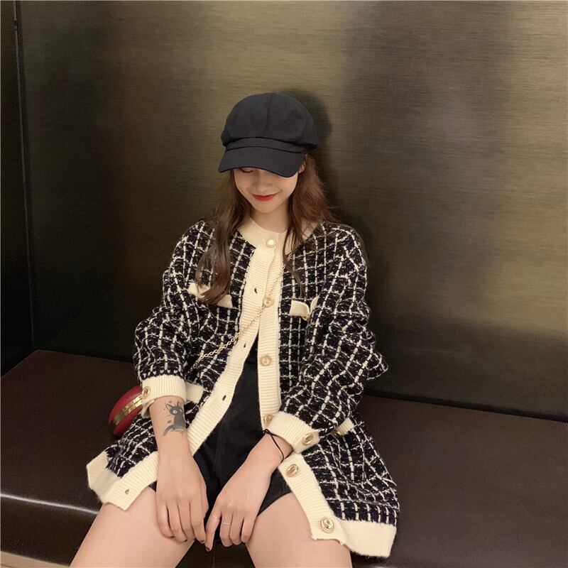 黒チェック柄カーディガンセーターデ春秋 Y2k 特大セーターニットカーディガンプル ブラック スプリング 春物 オータム 秋物