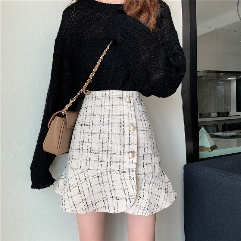 ウエスト A ラインラップヒップスカートフリル黒フィッシュテールスカートミニスタイル Y2k 服ツイードチェック柄スカート段 Faldas ブラック Aライン