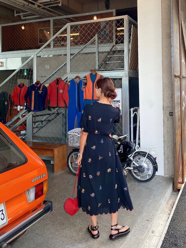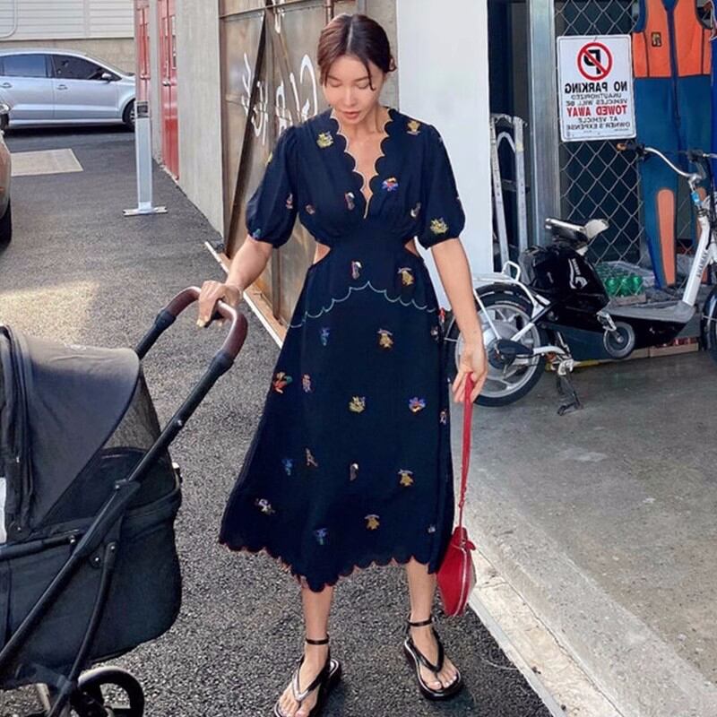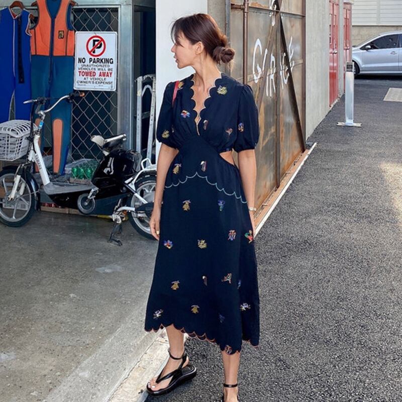 V ネック刺繍フラワーくり抜きウエストセクシースイング Vestidos エスパラマキシドレス レッド Vネック フラワーデザイン