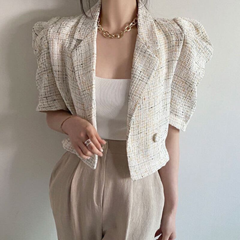 ノッチパフ半袖クロップトップ Chaquetas ピンクツイードジャケットシックスタイル Jaqueta チェック柄コートシャツ ショート ハーフスリーブ