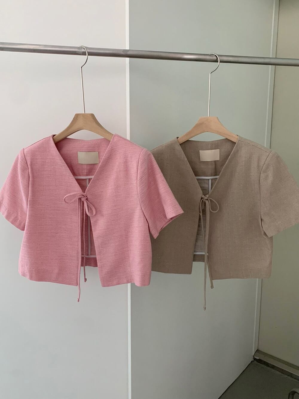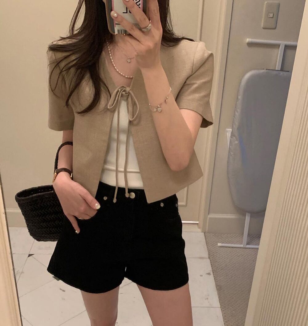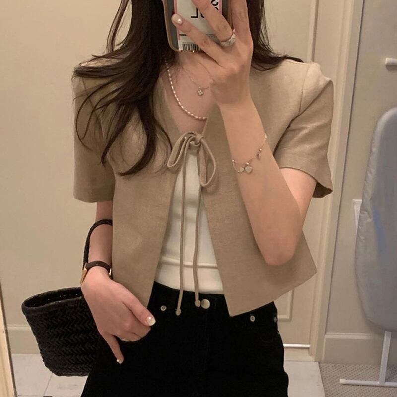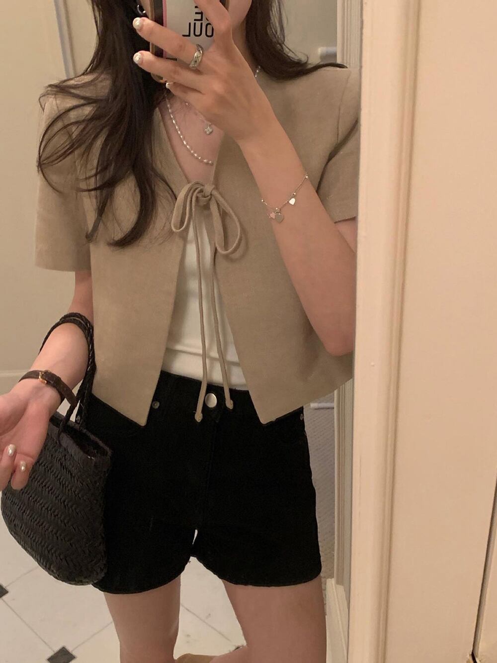 レースアップ V ネックピンクツイードジャケット Chaqueta クロップブレザー服 Jaquetas 半袖コートシャツ ショート ハーフスリーブ Vネック
