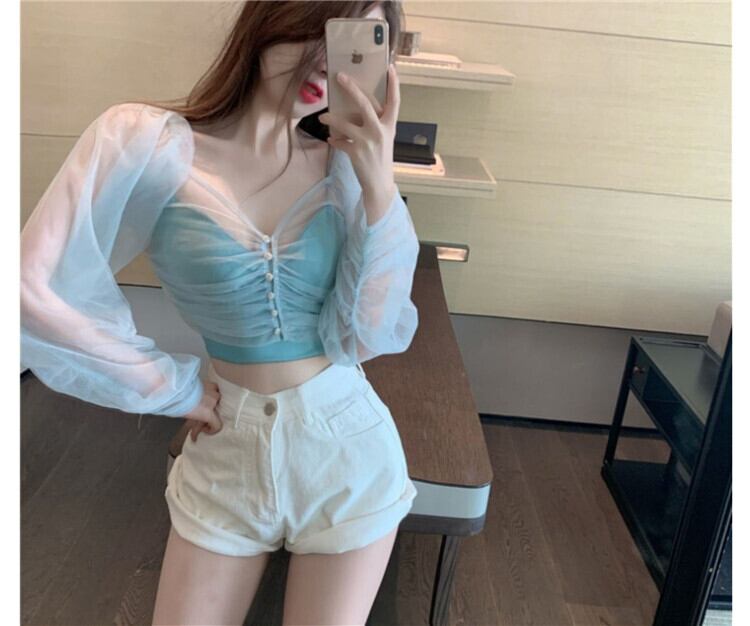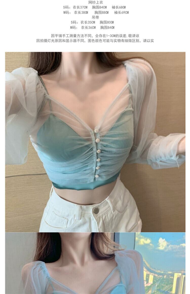日焼け止め長袖セクシーショートウエストシャツトップツーピース春遠近メッシュ2セットタンクトップスキャミソール ロング スプリング 春物
