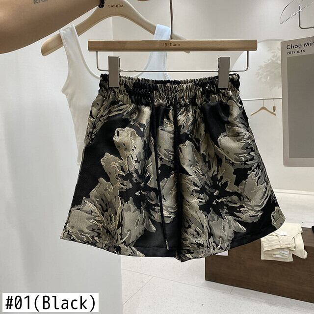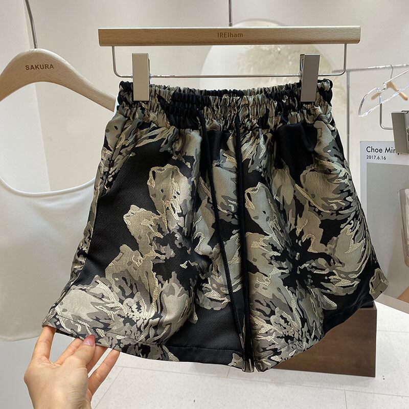 ショートパンツプリントウエストルーズ A ラインホットレトロワイドレッグジャカードショーツ Y2k 花ショート ブルマー 花柄 Aライン ワイドパンツ