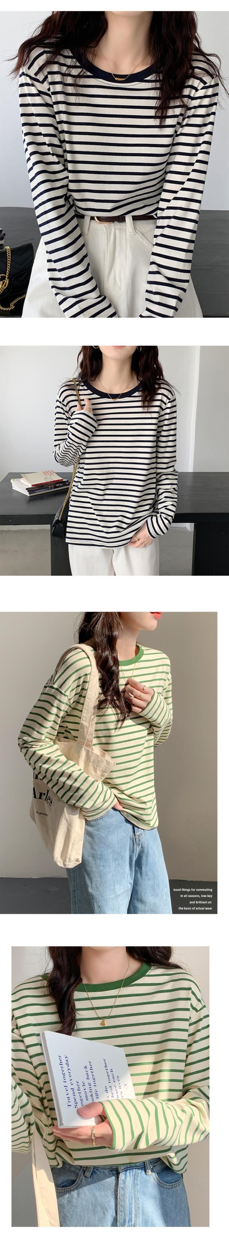 秋 Tシャツルーズコットン Tシャツトップ Tシャツグリーンブラックストライプ長袖 Tシャツ基本的冬 ロング オータム 秋物 ウィンター 冬物