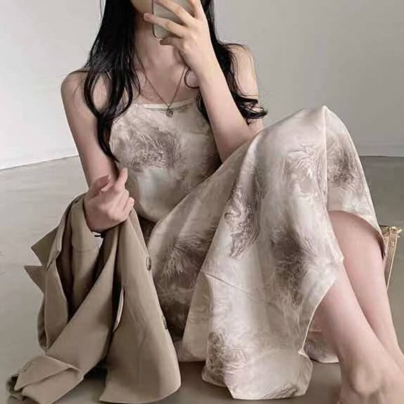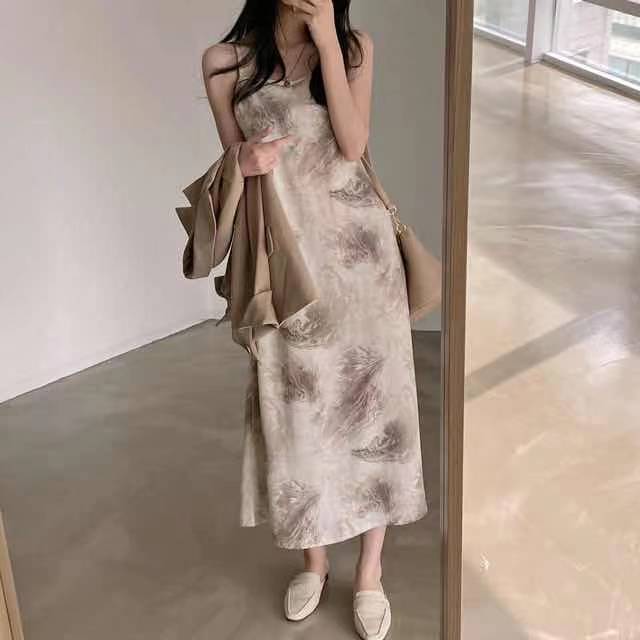 タンクセクシーキャミソールドレス Vestidos es ビーチドレスボトムレトロ絞り染めドレスグレーインクプリントローブ