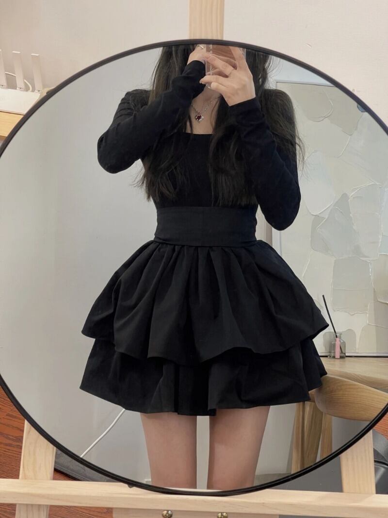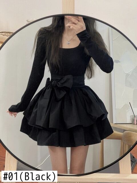 Y2k セクシーフェイク 2 リボン長袖黒ケーキドレスミニパーティードレスローブ春スリム Vestidos ドレス ロング ブラック スプリング 春物