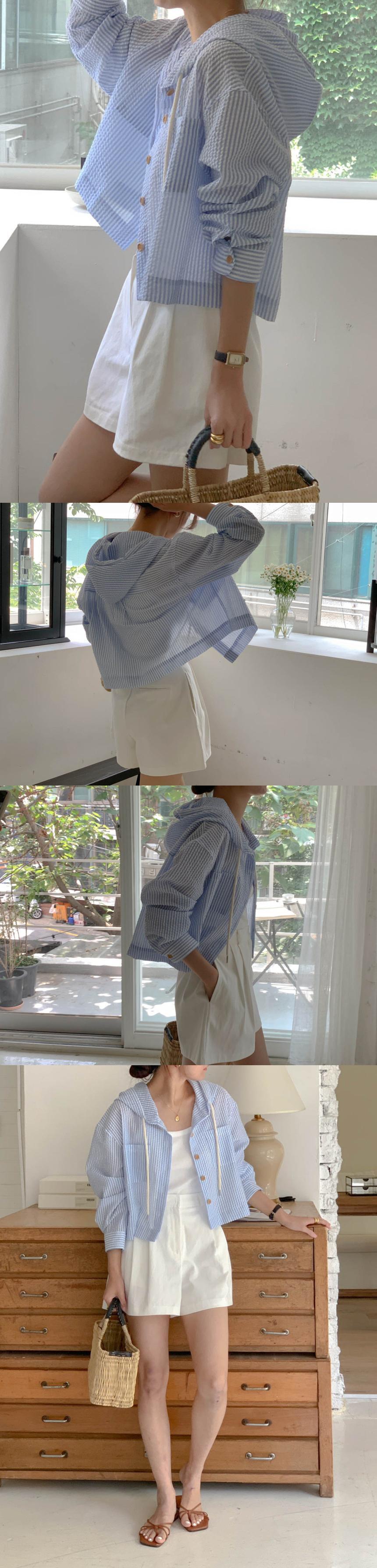 ワイルドシングルブレストコントラストショートルーズ長袖日焼け防止フード付きシャツ青白ストライプコートボタンジャケット ロング ホワイト ブルー