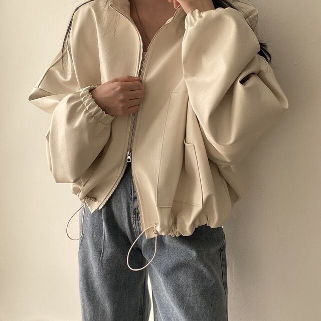 ジッパーレザージャケットシックルーズコート巾着レースアップポケット生き抜くスタンドアップ襟冬トップ ウィンター 冬物