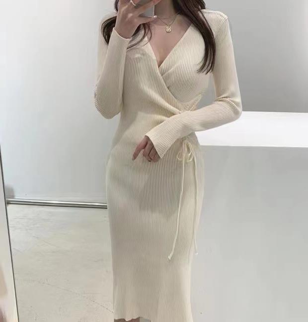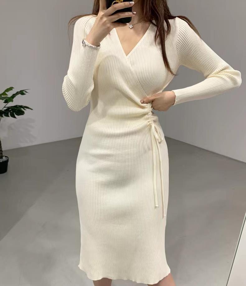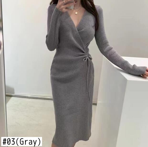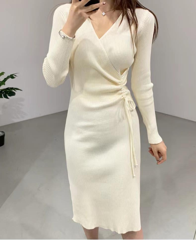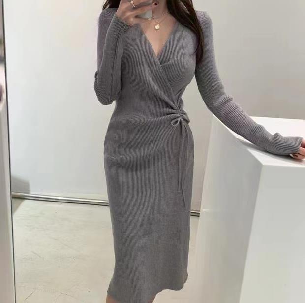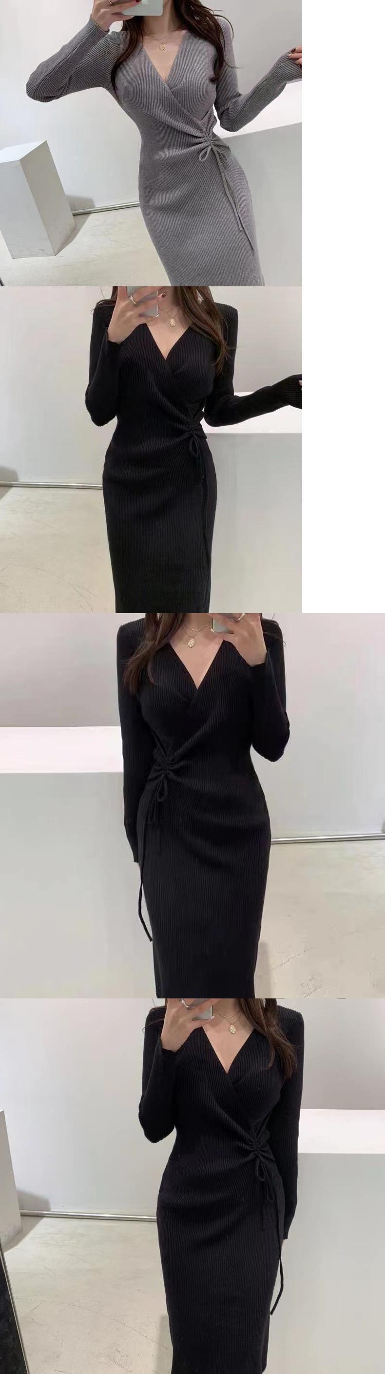 Vestidos es ライト成熟した V ネックプリーツ巾着ウエストラップ臀部ニットドレスグレーブラック Y2k セーター Vネック