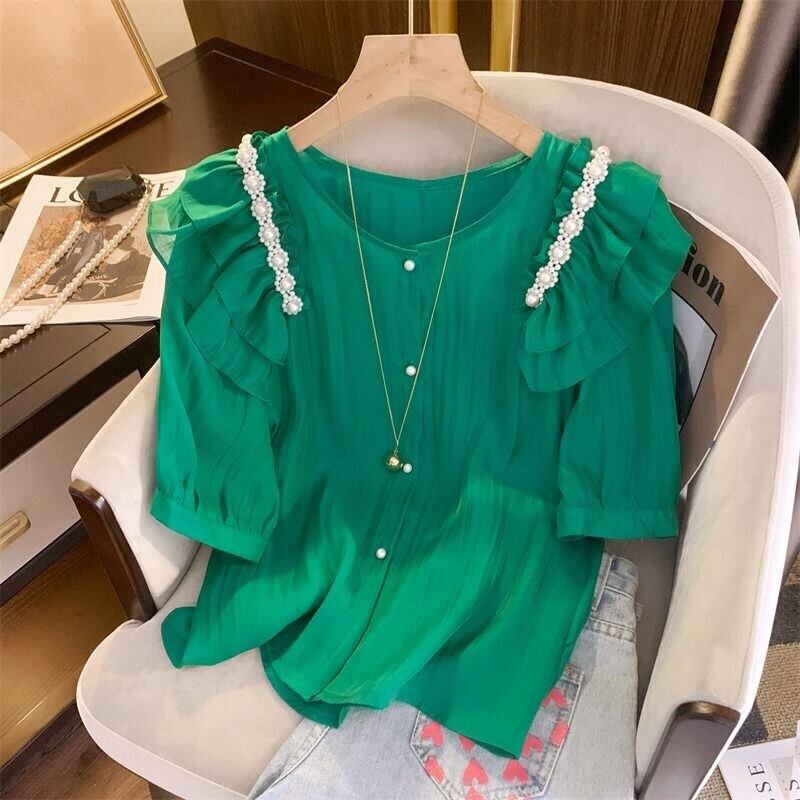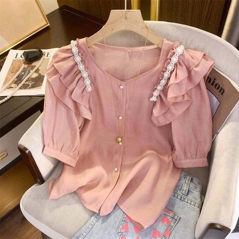 シャツピンクブラウストップ半袖シャツシフォンビーズシャツ ショート ハーフスリーブ