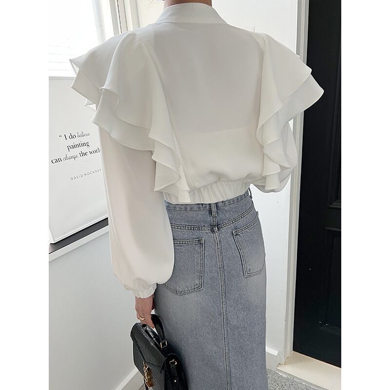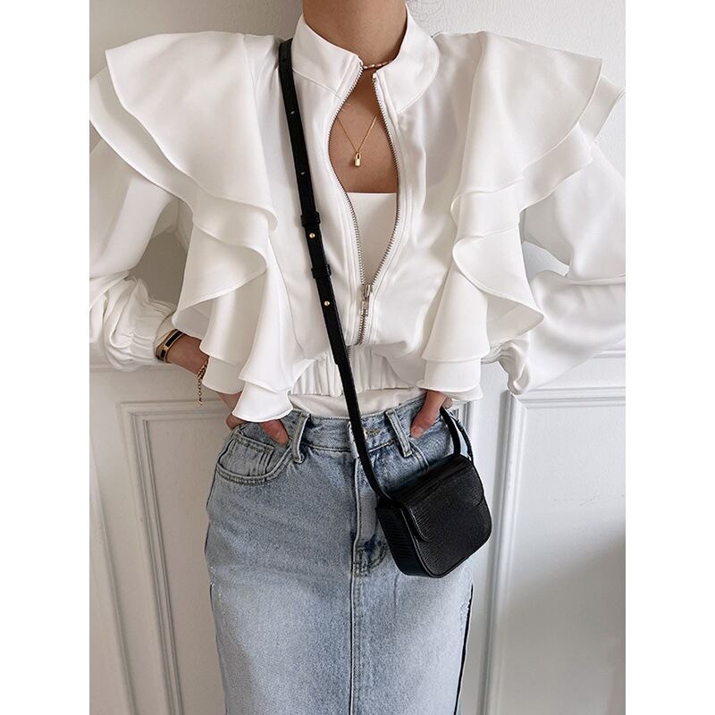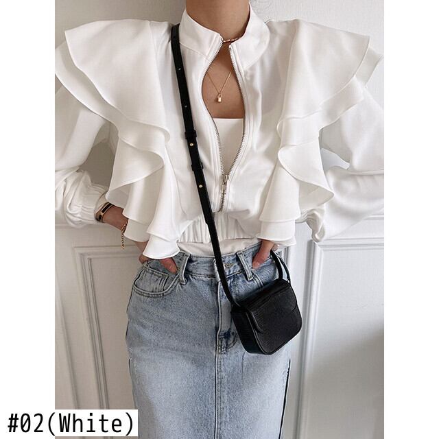 シック二重層フリル カーディガン薄いコート チャケータス ホワイト ジャケット ジッパー スウェット スリーブ シャツ クロップ トップ