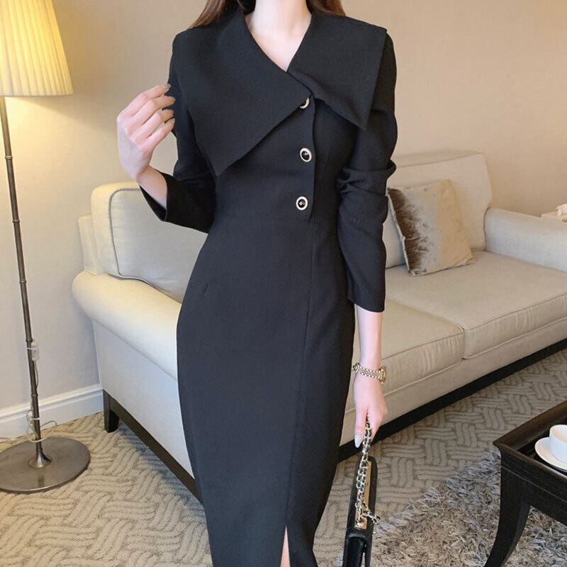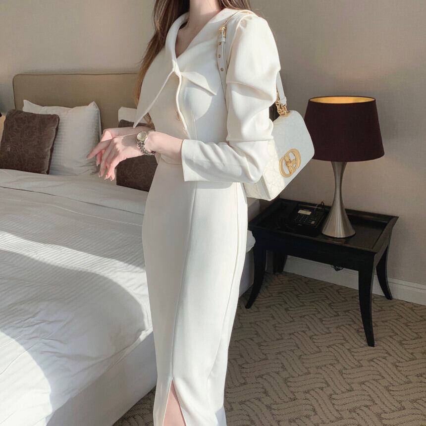 Vestidos de es 春シンプルラペルネックサイドバックルウエストラップ長袖シフォンドレス ロング スプリング 春物
