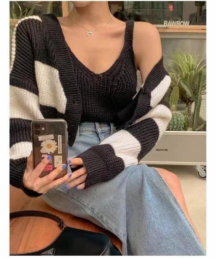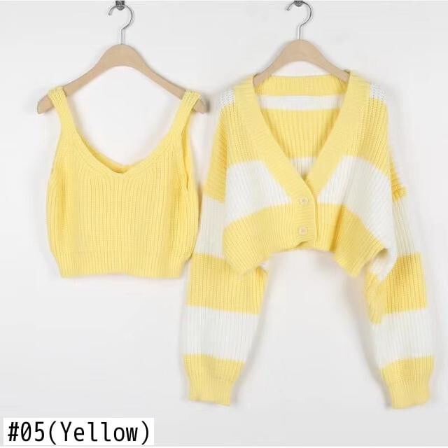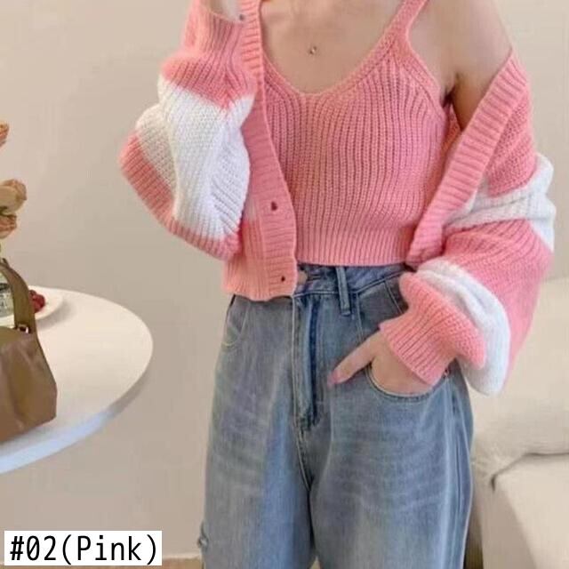 タンクトップ キャミソール ニット 2 点セット ピンク カーディガン セーター クロップド セーター V ネック コート 長袖プル ロング Vネック