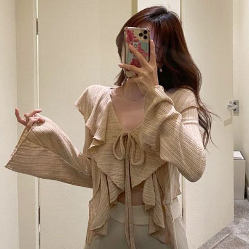 フレンチシックフリルフレアスリーブタイアップシャツ秋長袖Tシャツセーター黒ニットトップスリムセーター ロング レッド ブラック オータム 秋物