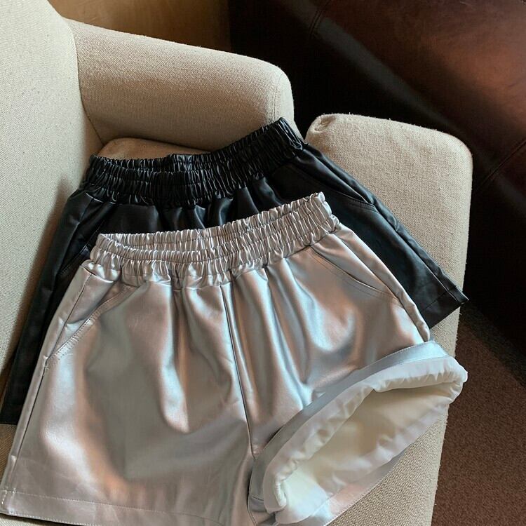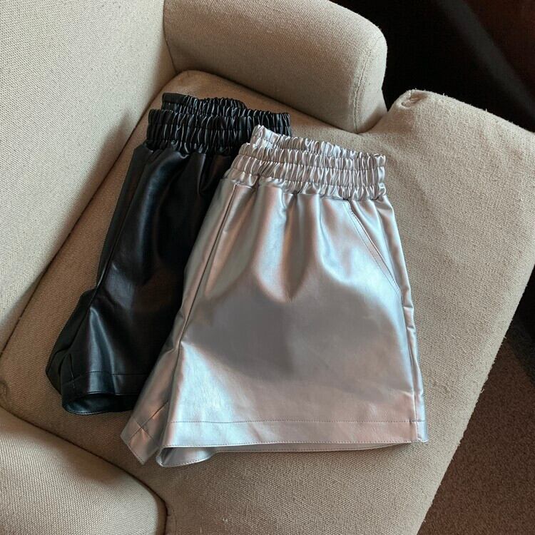 弾性ウエストショーツソリッドカラー多用途ワイドレッグ黒革ショートパンツ Y2k セクシー Pantalones Cortos De ブラック エラスティック 伸縮 レザー ブルマー ワイドパンツ