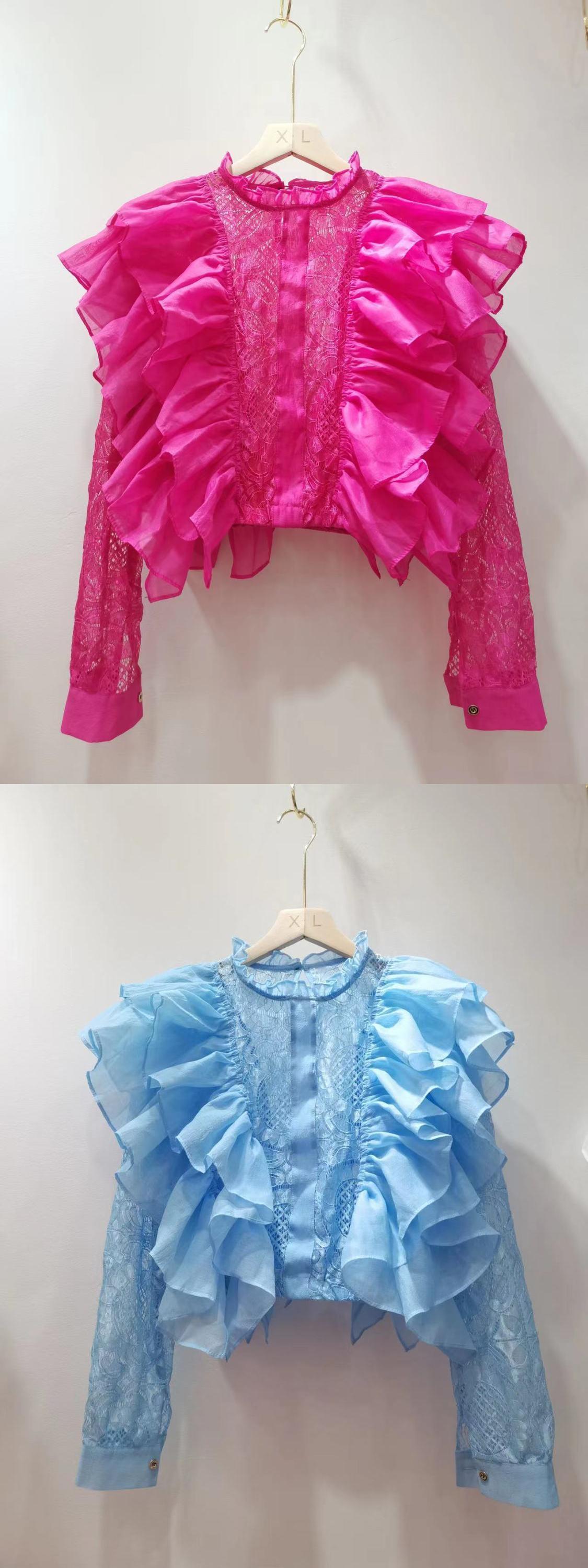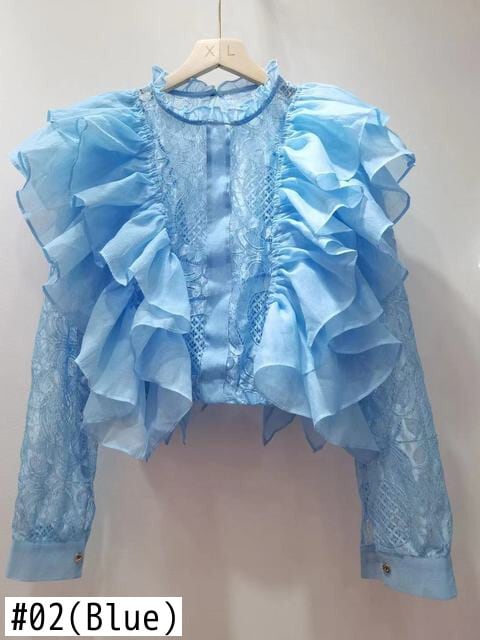 フリルフラワーくり抜きスタンドカラーブラックレースシャツショートトップ甘いブラウスクロップ 大人ガーリー スウィート キュート カジュアル フラワーデザイン
