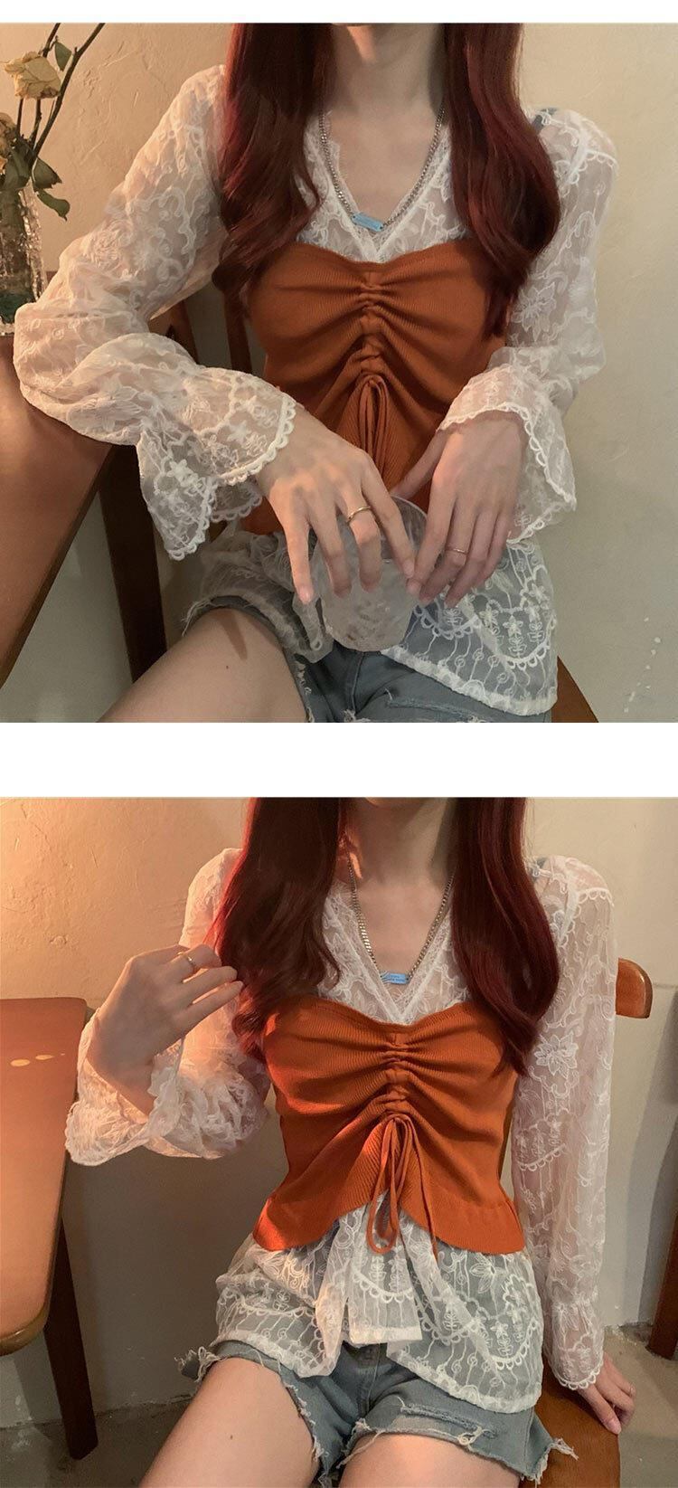 偽 2 巾着フレアスリム長袖シャツ Y2k グラフィック Tシャツグランジ服レースシャツニットボトム ロング