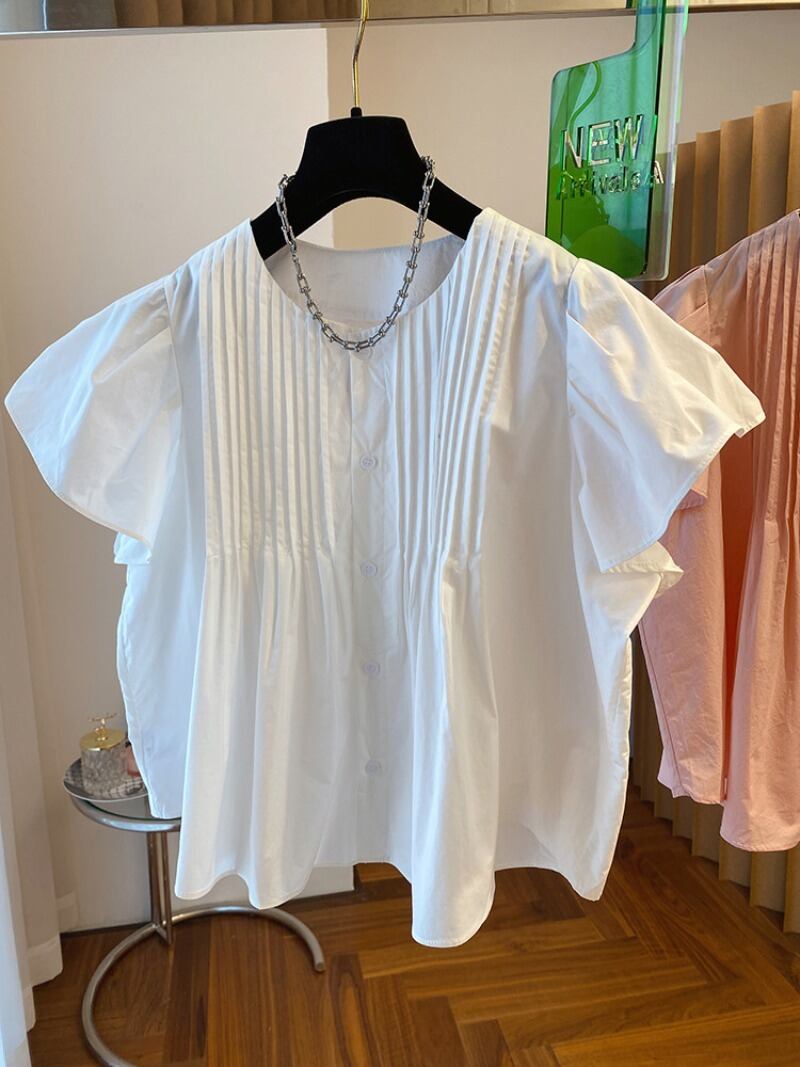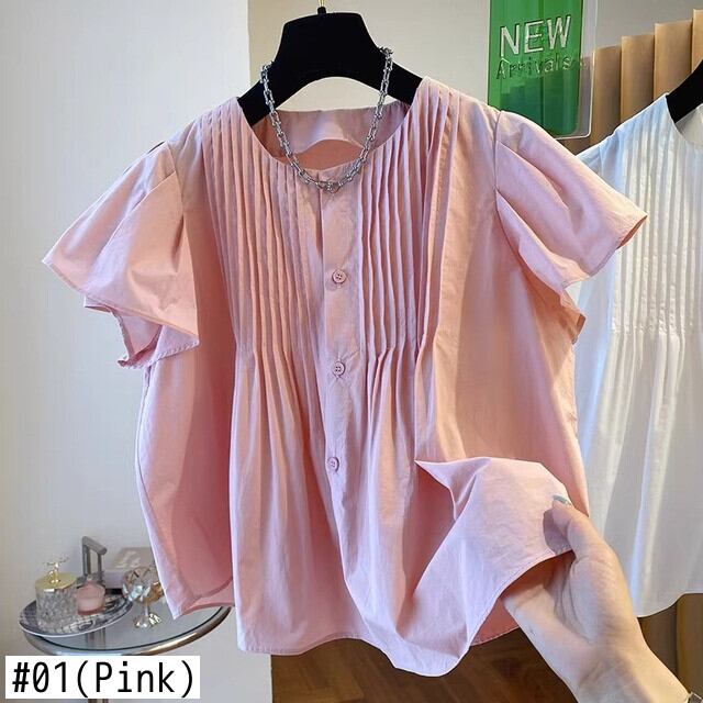 トップス 半袖ルーズピンクドールシャツ フライングスリーブシャツ スイートブラウス プリーツシャツ ショート ハーフスリーブ 大人ガーリー スウィート キュート カジュアル