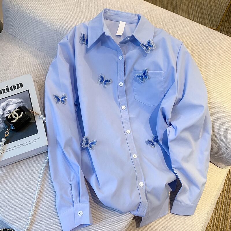 ブルーブラウスボタンアップシャツ蝶シングルブレストルーズ長袖春スイートシック刺繍 ロング 大人ガーリー スウィート キュート カジュアル スプリング 春物