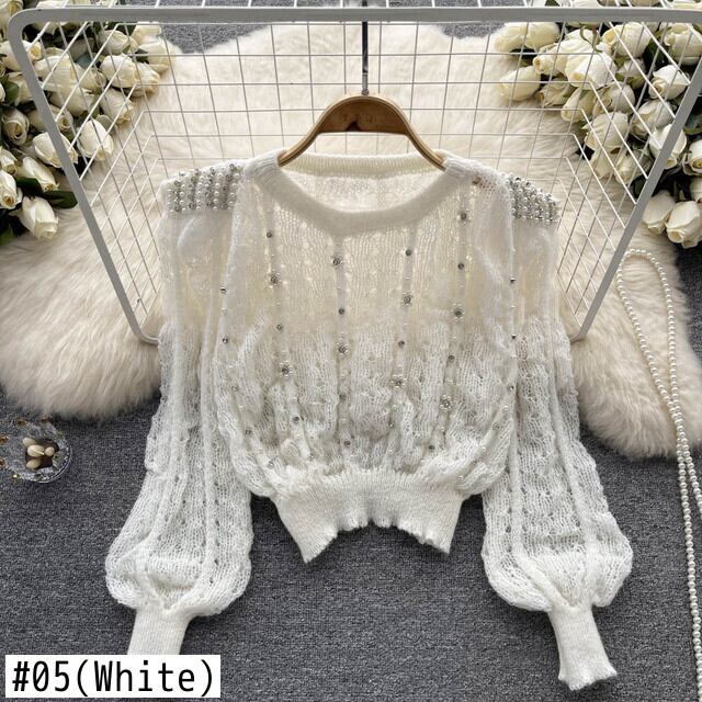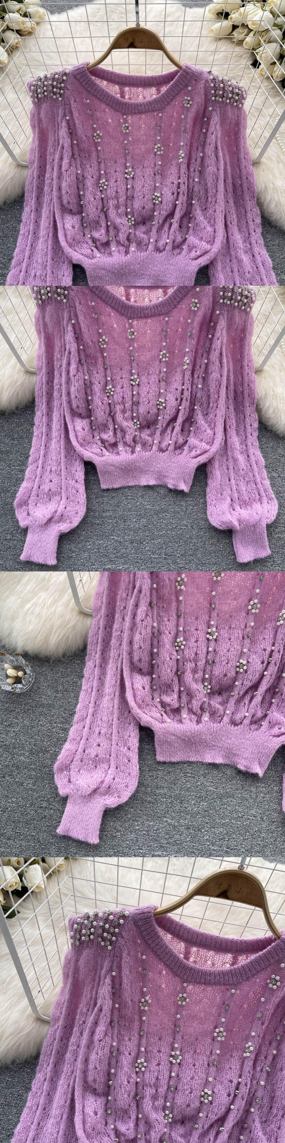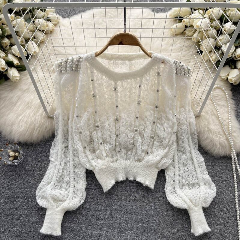 長袖ボトムトップスタッズソフトラウンドネックセーター秋中空アウト Y2k プルプルオーバーセーターセーターデ ロング オータム 秋物 Oネック