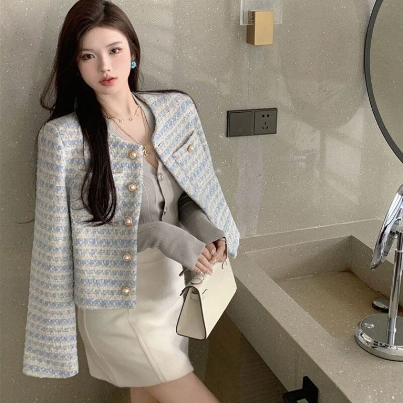 ブルートップスツイードストライプジャケットロパ気質チュニックコート婦人服