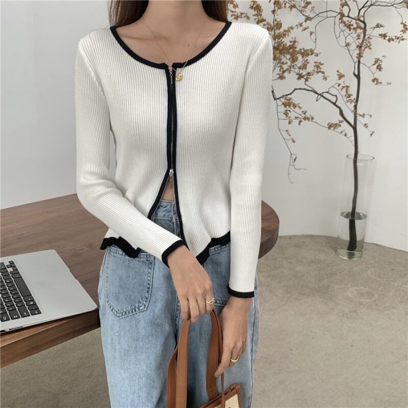 ダブルジッパーソフト長袖ニットカーディガンボトムシャツY2kプルクロップドカーディガンブルーセータージャージトップ ロング