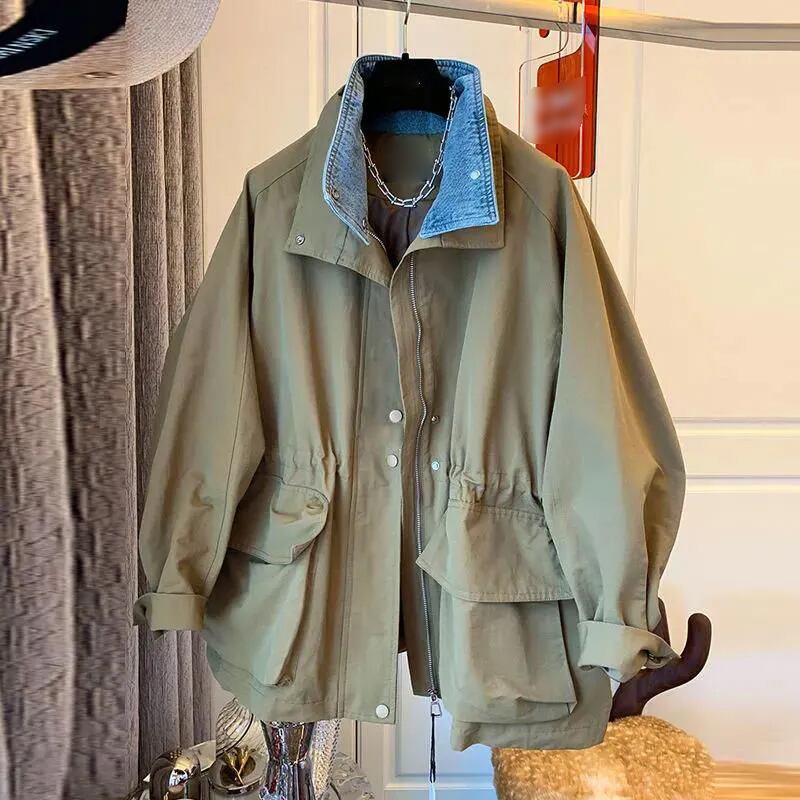 ボンバージャケット巾着フェイクツーピーストレンチスタンドカラーデニムコートグランジ Y2k チャケータレトロ
