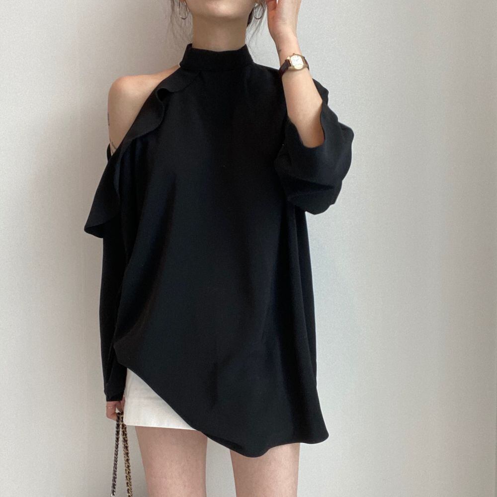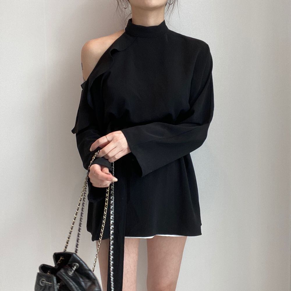 es フレンチスタイルスタンドカラー不規則オフショルダーフリルレースアップウエスト長袖白シャツトップ ロング ホワイト