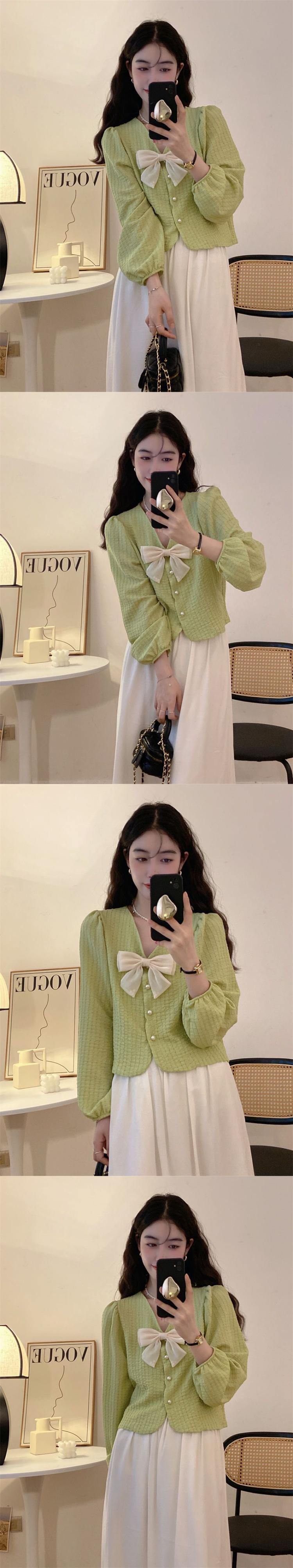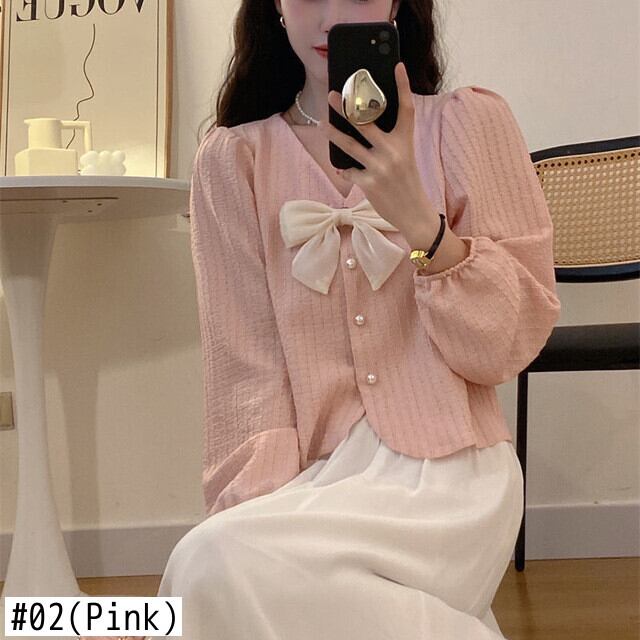 シックトップバブルスリーブピンクシャツフレンチボウシャツses長袖ブラウスvネックシャツ ロング リボン